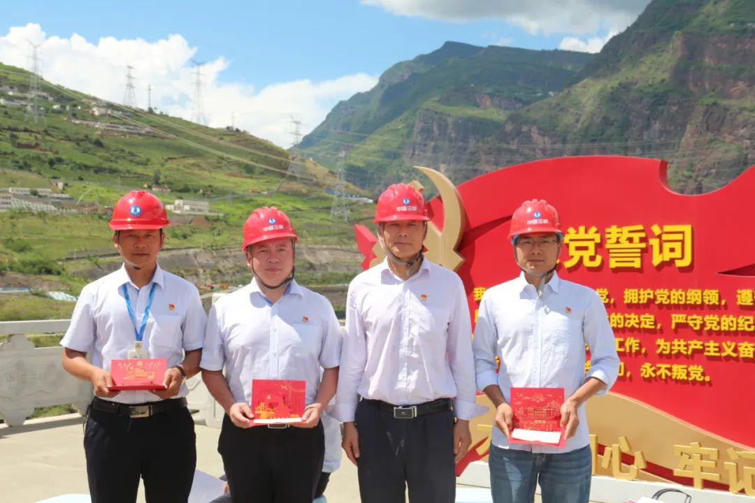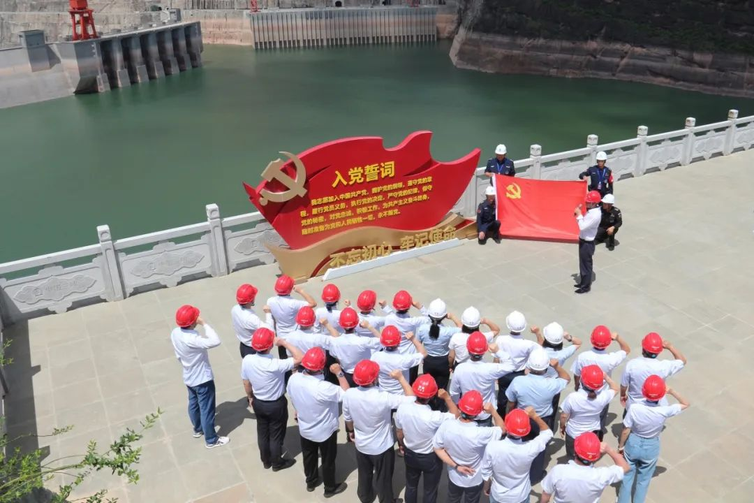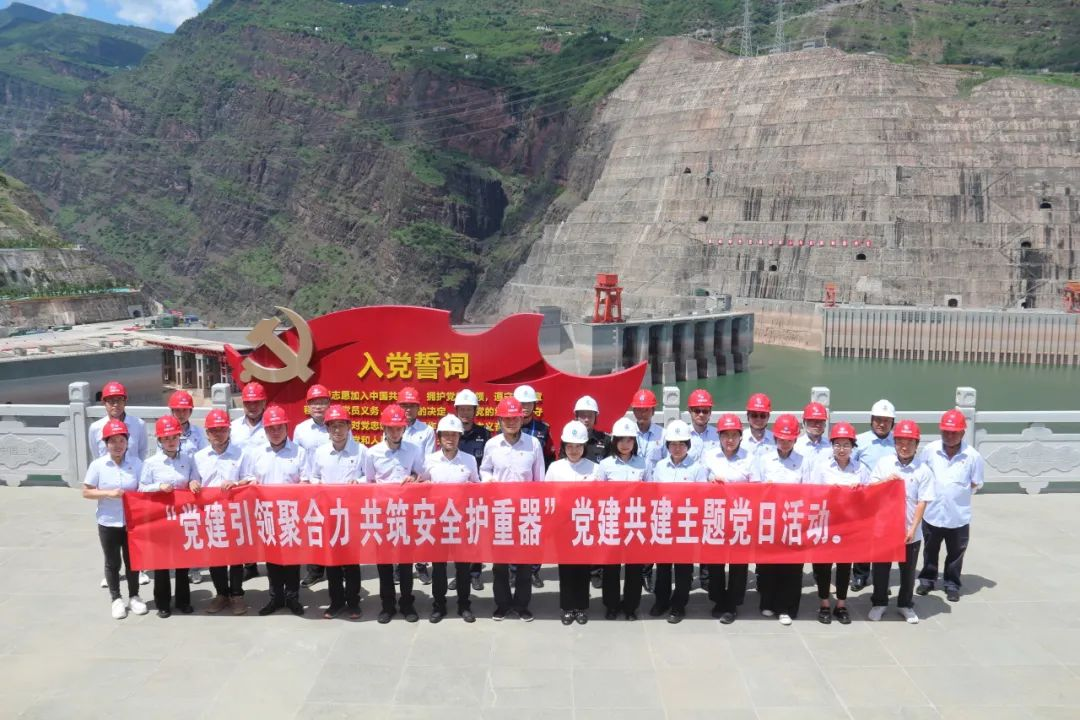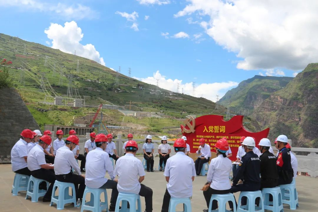“我志愿加入中国共产党......”面对鲜红党旗,全体党员高举右拳,铿锵誓言响彻云霄。重温入党誓词后,党员们深入学习习近平总书记致金沙江白鹤滩水电站首批机组投产发电的贺信,深刻领悟“国之重器”背后的责任与担当。随后,大家近距离参观大坝全貌,感受超级工程的磅礴魅力,进一步坚定守护能源安全的使命意识。