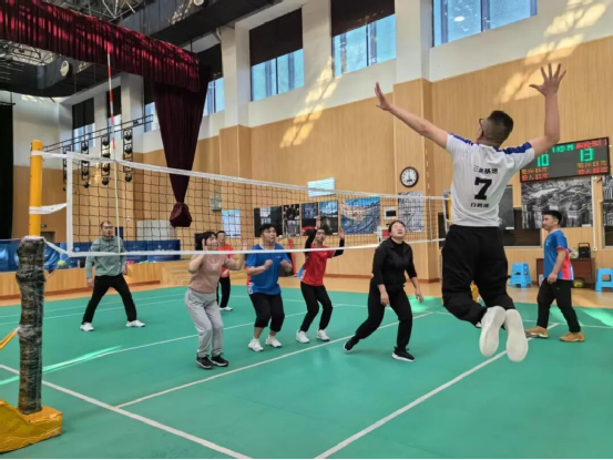 比赛中,队员们身手敏捷、配合默契:年轻队员奋不顾身、飞身扑救;老将们坚持不懈、顽强拼搏;裁判员公正执裁、一丝不苟。一次次精准的扣杀、一场场惊险的救球,不断将比赛推向高潮。文体中心内助威声、喝彩声此起彼伏,赛场上下洋溢着欢声笑语,充分展现出团结协作、奋发向上的精神风貌。