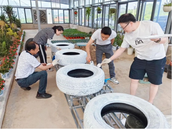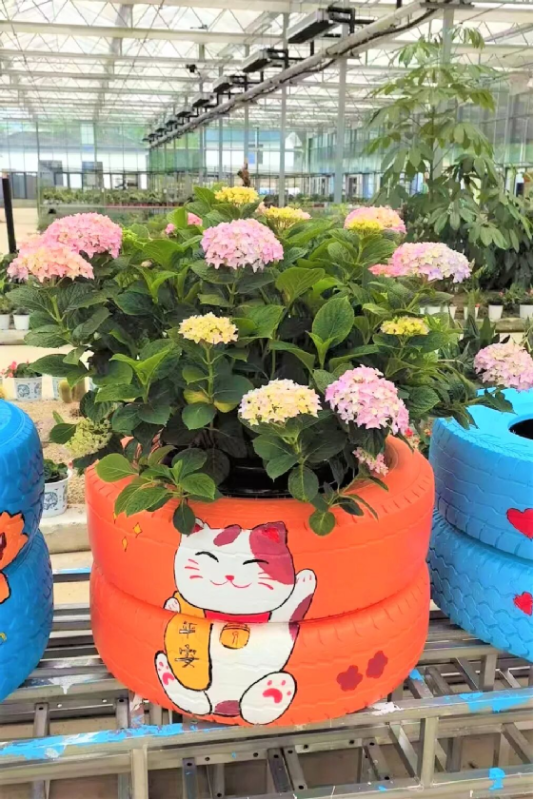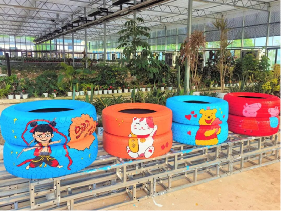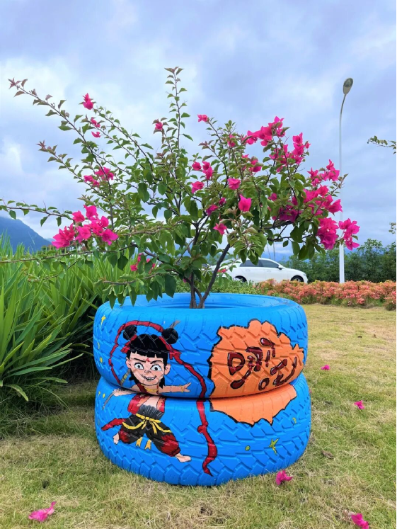 除了轮胎画,园林公司还将轮胎与园艺结合,做成花盆。填入土壤,种上三角梅、绣球、绿萝等植物,绿叶从轮胎边缘舒展,花朵在“轮胎容器”中绽放,工业感与自然美和谐相融。