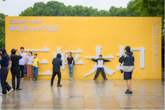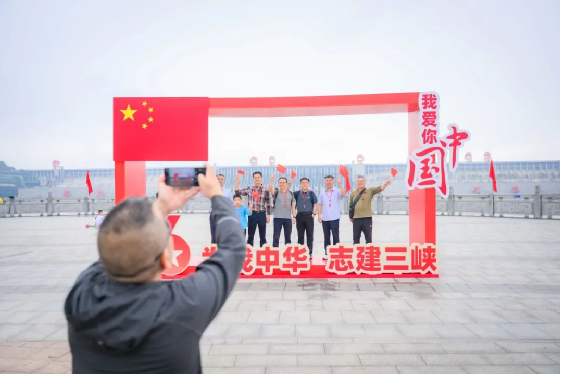 在“与国同框”的巨型相框里,与五星红旗同框,展现你的自豪;来“三峡大坝”的双人字造型点,摆出创意姿势,感受大国工程的伟岸;到“我爱你中国”背景墙前,留下你对祖国最深情的告白。